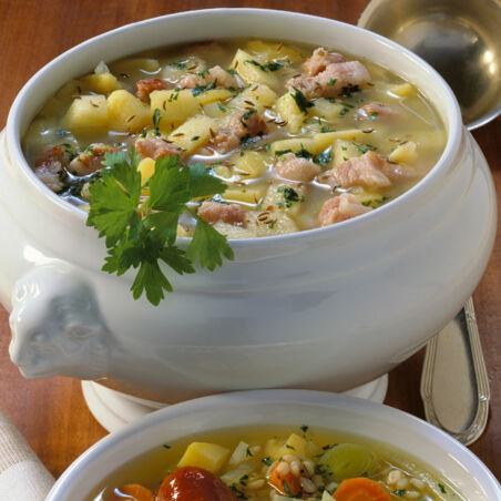 Wie zu Omas Zeiten kommt dieser deftige Eintopf daher. Kümmelwürzig mit Schweinebauch und Steckrüben ist er ein richtiger Sattmacher.