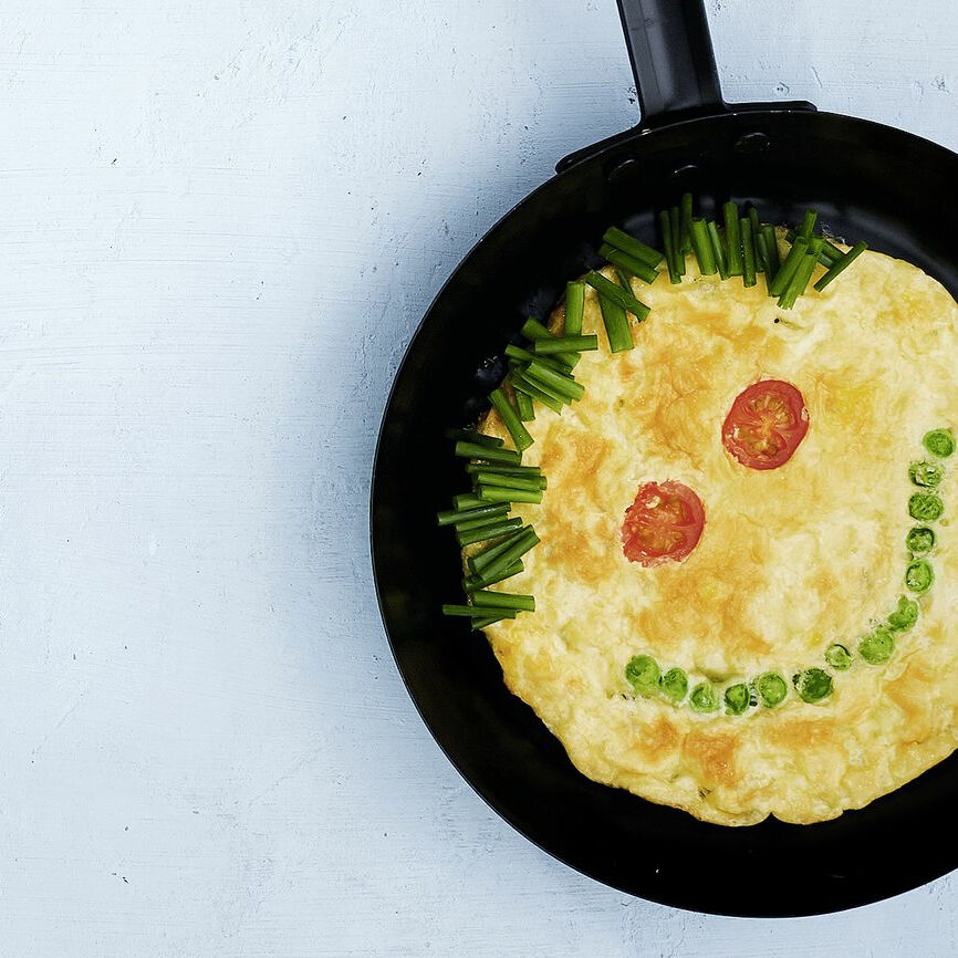 Dieses Omelette sorgt mit seinem freundlichen Lächeln für mehr Freude am Frühstückstisch. Perfekt für Kinder ab 1 Jahr.
