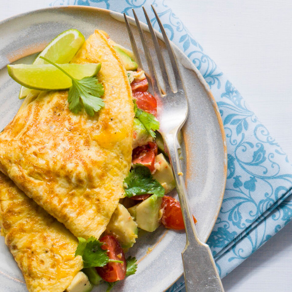 Omelett ist sehr vielseitig kombinierbar. Hier kommen Kirschtomaten und Avocado als Füllung hinein.