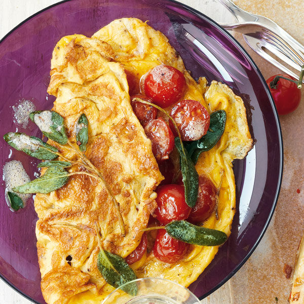 Das saftige Omelett mit reifen Kirschtomaten ist einfach perfekt als schnelles, einfaches Essen, das jedem gut schmeckt.