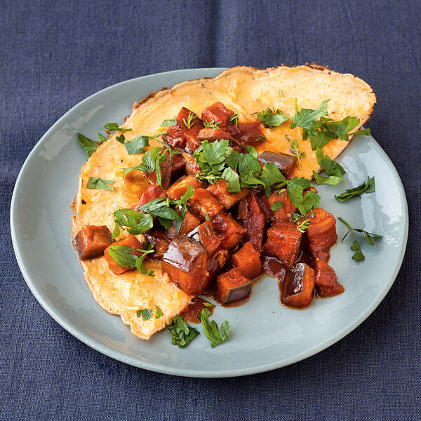 Die Omeletthälften auf je einen Teller gleiten lassen und mit Auberginen belegen, mit Petersilie bestreuen und halbieren.
