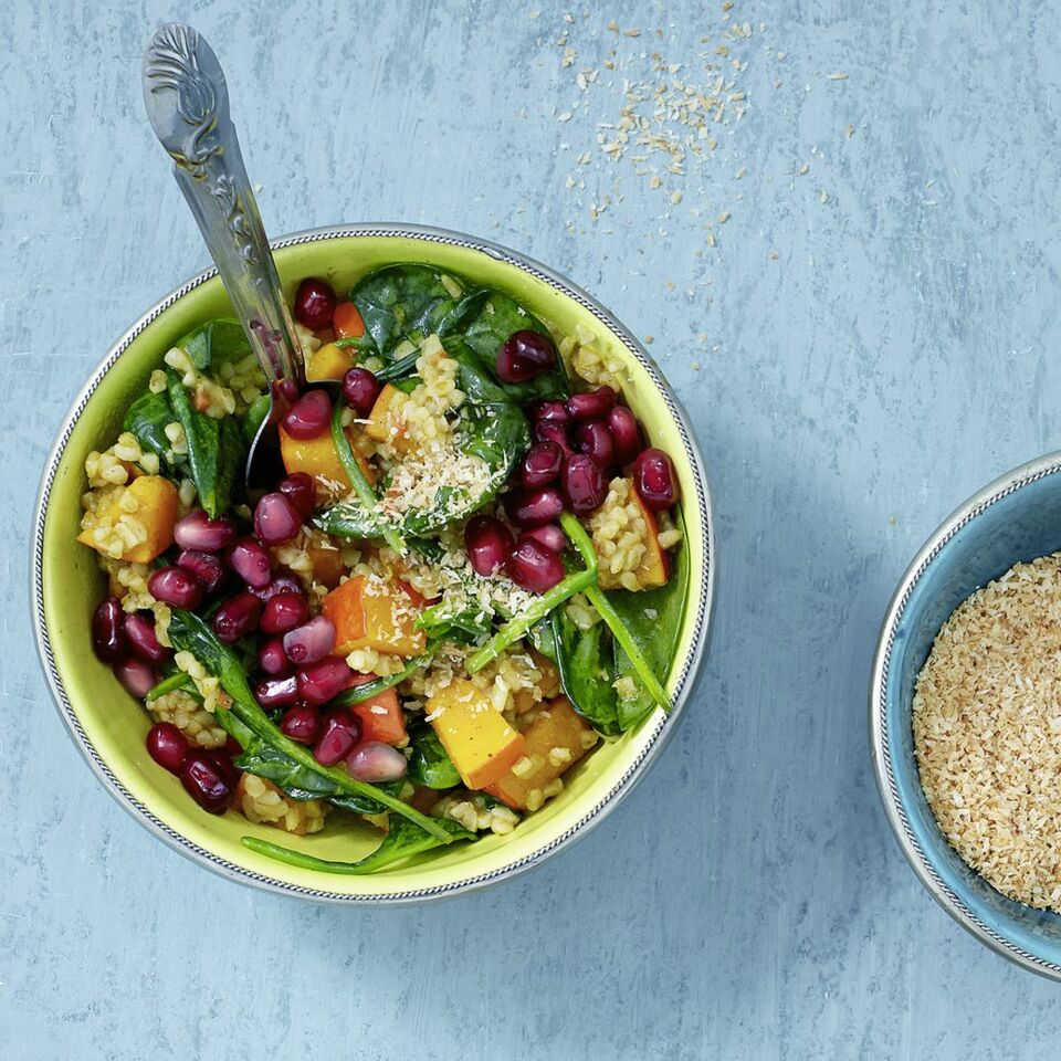 In einer kleinen Pfanne die Kokosraspel ohne Fett goldbraun anrösten. Den Spinat zum One-Pot-Bulgur geben, untermischen und zugedeckt 2 Min. garen. Das Gericht mit Salz abschmecken.