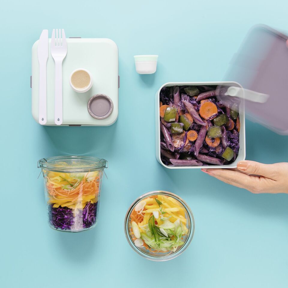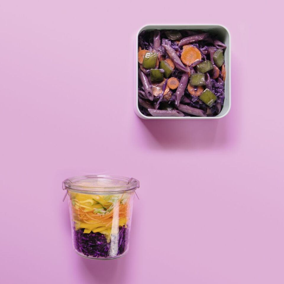 Mittags eine asiatisch angehauchte One-Pot-Pasta oder lieber deftiger Rotkohl-Gemüsesalat? Geht beides mit diesem Meal-Prep-Rezept!