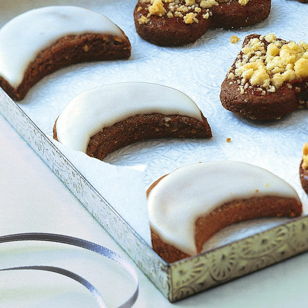 Aus Puderzucker und Orangensaft einen Guss rühren und die Monde damit bestreichen.