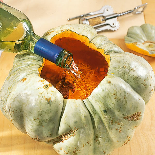 Kürbisfleisch, Orangenfilets und -schale mit dem Orangenlikör, dem Puderzucker, dem Zimt- und Nelkenpulver in den Kürbis geben. Den Weißwein angießen (Step 3). 2 Std. kalt stellen.