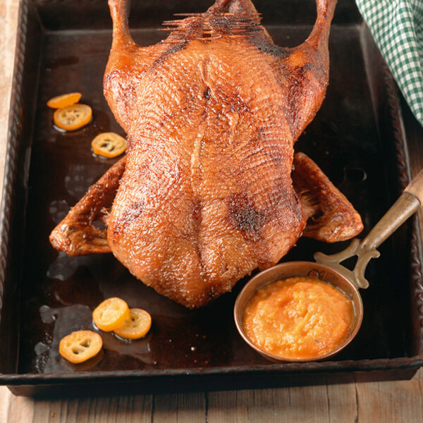 Die Ente herausnehmen, Temperatur auf 220° erhöhen. Die Ente tranchieren, Füllung und Saft aus der Fettpfanne durch ein feines Sieb zum Fond gießen. Die Kumquats hinzufügen. Die Entenstücke mit der Hautseite nach oben wieder in die Fettpfanne geben. Die Orangenmarmelade mit 1 TL heißem Wasser verrühren und die Haut damit bestreichen. Den Grill zuschalten und die Entenstücke im Ofen (oben) 3-4 Min. goldbraun übergrillen. Mit Sauce und Kürbispüree auf vorgewärmten Tellern servieren.