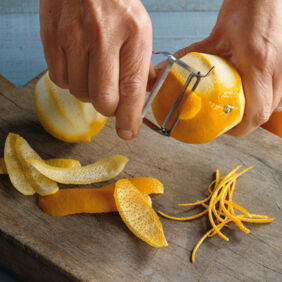 Die Zitrone und 1 Orange heiß waschen und abtrocknen, die Hälfte der Zitronenschale und die gesamte Schale der Orange dünn abschälen und in feine Streifen schneiden. Die Orange und die Zitrone auspressen.