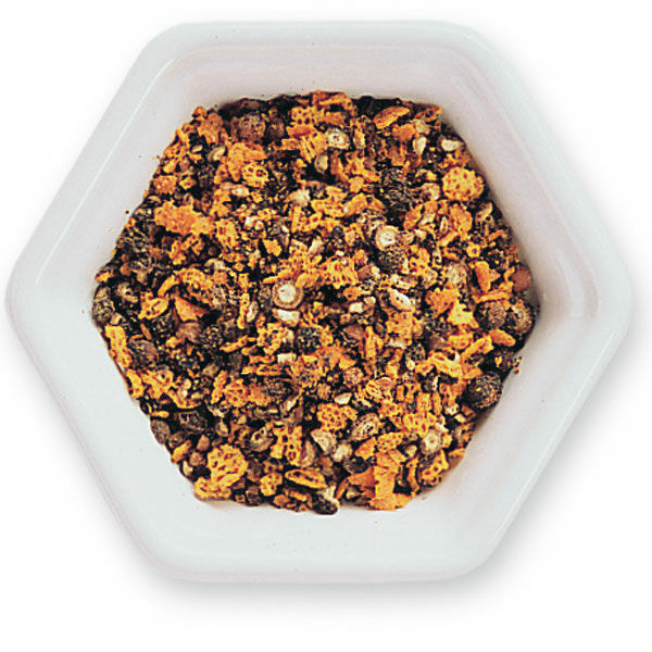 Die getrockneten Orangenschalen im Mörser in Stückchen (2-3 mm) brechen. Mit den schwarzen Pfefferkörnern mischen.