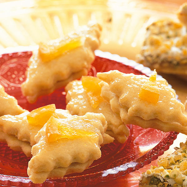 Die restliche Marmelade durch ein Sieb streichen, nochmals kurz erhitzen und die Plätzchen damit überziehen. Die kandierten Orangenscheiben in kleine Stücke schneiden und das Gebäck damit verzieren. Gut trocknen lassen.