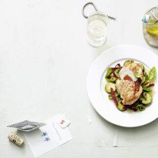 Inzwischen die Pinienkerne in einer Pfanne ohne Fett goldgelb rösten. Die Zwiebel schälen und in feine Streifen schneiden. Den Radicchio halbieren und den Strunk herausschneiden. Die Blätter waschen, trocken schleudern und fein zerschneiden. Das Fenchelgrün fein hacken.