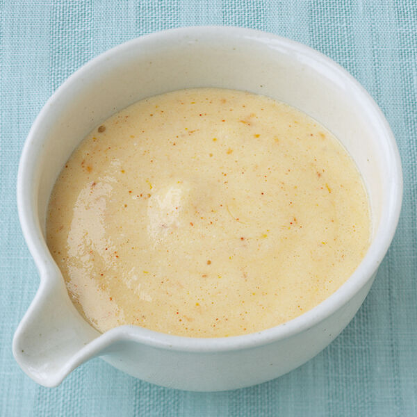 Orangensaft mit Mayonnaise verrühren, mit Salz, Pfeffer, Cayennepfeffer, Orangen- und Zitronenschale würzen. Das Eiweiß sehr steif schlagen und unter die Mayonnaise heben.