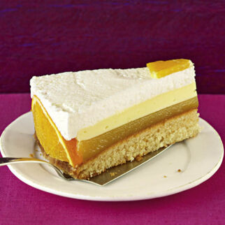Die Springform mit Butter ausstreichen und mit Mehl ausstäuben. Den Teig auf der bemehlten Arbeitsfläche zu einem Kreis von etwa 32 cm Ø ausrollen. Die Form mit dem Teig auskleiden, dabei einen etwa 2 cm hohen Rand formen. Die Orangencreme in die Springform füllen und den Kuchen im heißen Backofen etwa 30 Min. (Mitte, Umluft 160°) backen.