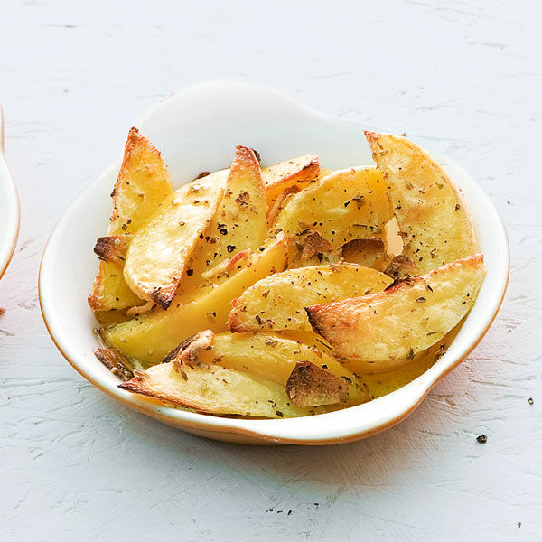 Kartoffeln schälen, waschen und längs in dünne Scheiben schneiden. Kartoffelspalten mit Knoblauch, 3 EL Olivenöl, Oregano und Salz vermischen und in eine ofenfeste Auflaufform (ca. 20 x 25 cm) geben.