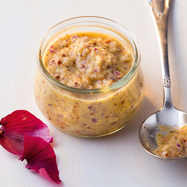 Zwiebeln in einem Sieb ausdrücken. Mit übrigem Zitronensaft, Gewürzen und Öl im Blitzhacker pürieren. Mit Paprikapulver und Kreuzkümmel abschmecken. Abfüllen und mit etwas Öl bedecken.