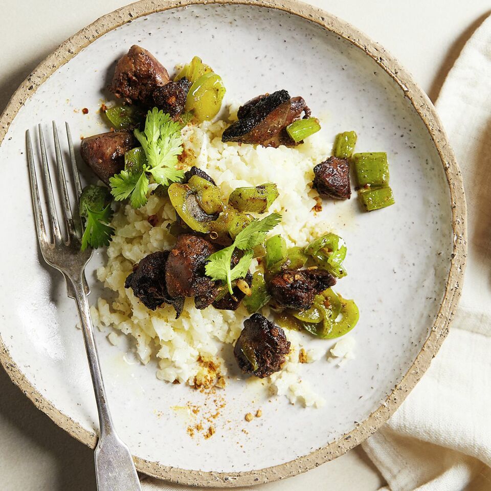 Die Lebern waschen, trocken tupfen und 1 cm groß würfeln. Paprika waschen, putzen und genauso groß würfeln. Den Blumenkohl waschen, putzen, in kleine Röschen teilen und portionsweise in einem Standmixer zu reiskorngroßen Stückchen verarbeiten. Knoblauch schälen und fein hacken. Jalapeño waschen, putzen und in feine Ringe schneiden.