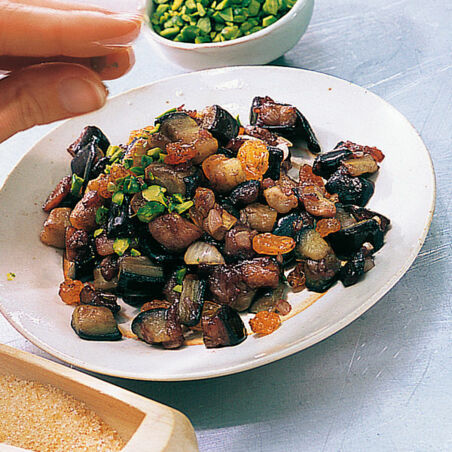 Geflügelfondkonzentrat und Granatapfelsirup mit 200 ml Wasser mischen. Das Gemüse damit ablöschen. Zucker und Gewürze zugeben. Alles bei mittlerer Hitze etwa 10 Min. schmoren, gelegentlich umrühren. Rosinen zufügen, weitere 10 Min. schmoren, bis die Auberginen schön weich sind. Eventuell mit Salz und Granatapfelsirup abschmecken. Pistazienkerne grob hacken und über die Auberginen streuen. Nach Belieben mit Granatapfelkernen garnieren.
