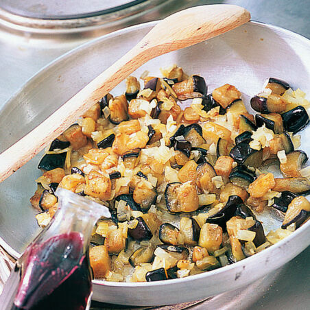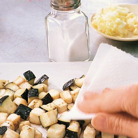 Die Auberginen waschen und putzen. Längs in 1 cm dicke Scheiben, dann in gleich breite Streifen und diese in Würfel schneiden. Auberginenwürfel salzen und abgedeckt 10 Min. stehen lassen. Inzwischen Zwiebeln und Knoblauch schälen. Die Zwiebeln fein hacken. Auberginen mit Küchenpapier gut trocken tupfen.
