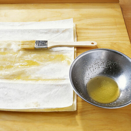 Ein Backblech mit Backpapier auslegen. Den Backofen auf 220° (Umluft 200°) vorheizen. Die restliche Butter zerlassen. Die Teigblätter mit etwas zerlassener Butter bestreichen und aufeinander legen. Die Ränder mit etwas verquirltem Eigelb bestreichen. Das Teigquadrat auf das Blech legen.