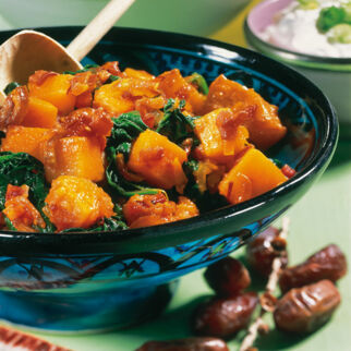Die durch Safran und Kurkuma leuchtend gelb gefärbten Zwiebeln im Farbenspiel mit dem grünen Spinat
