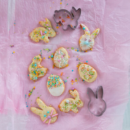 Backofen auf 200°C Ober- und Unterhitze vorheizen und ein Backblech mit Backpapier auslegen. Die Arbeitsfläche mit Mehl bestäuben und den Teig darauf ca. 1 cm dick ausrollen. Mit den Ausstechern Osterkekse aus dem Teig ausstechen und auf das Backblech legen. Für ca. 12 Minuten backen und anschließend auskühlen lassen.