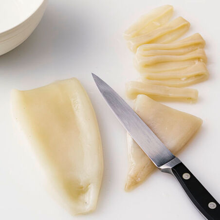 Zwiebel schälen, fein würfeln. Paprika längs halbieren, entkernen, waschen und in mundgerechte Stücke schneiden. Staudensellerie putzen, waschen und in ca. 1 cm breite Stücke schneiden. Die Oliven in dicke Ringe schneiden. Chili waschen und fein hacken. Kalmartuben waschen, trocken tupfen und in ca. 1 cm breite Ringe schneiden. Muscheln unter fließendem kaltem Wasser abbürsten, noch vorhandene Pockenmuscheln und Barthaare entfernen. Garnelen waschen und trocken tupfen.