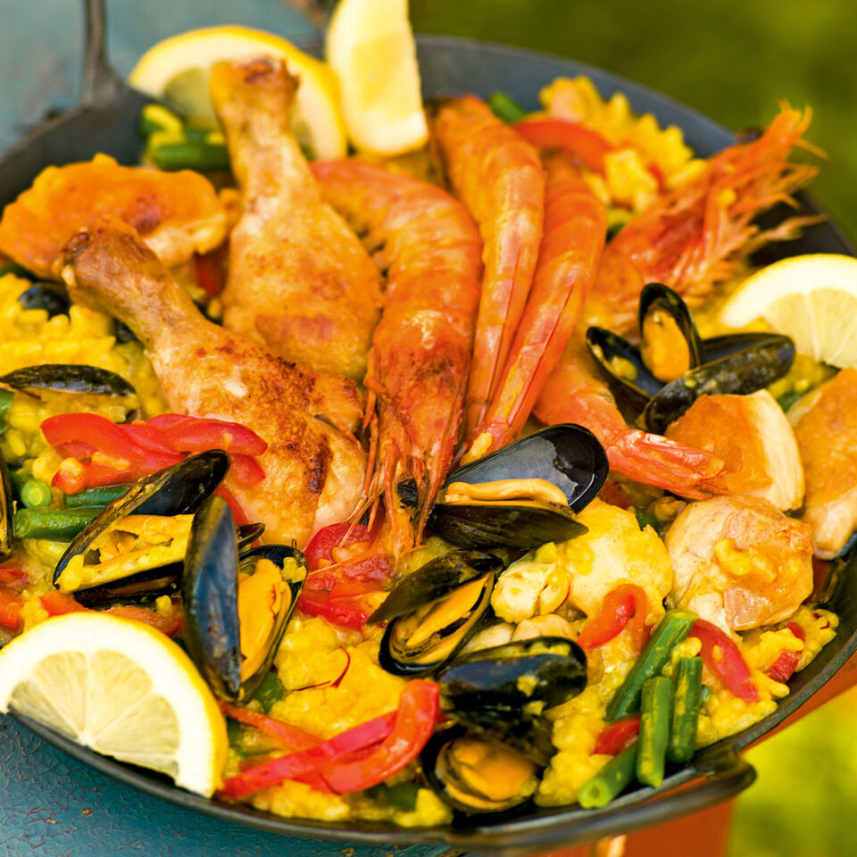 Paella - leuchtend gelber Safranreis mit Gemüse, Fleisch und Garnelen, alles in der typischen spanischen Henkelpfanne zubereitet und serviert - ein Gedicht.