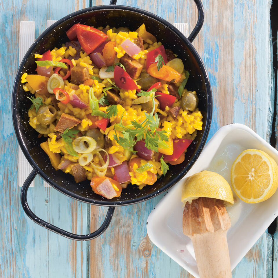 Zwei Reis-Klassiker in einem! Statt Seitan können Sie Räuchertofu oder Tempeh verwenden und / oder die Paella mit Schafskäse und gerösteten Mandeln servieren.