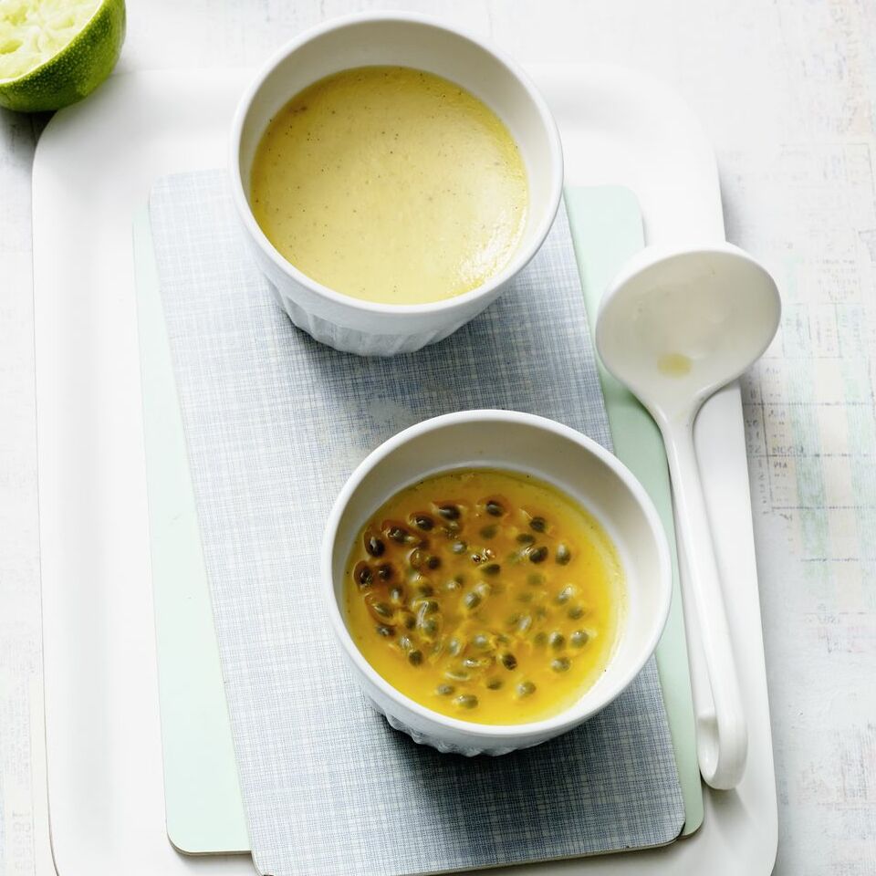 Falls Sie keine Maracujas (Passionsfrüchte) bekommen, die Creme einfach mit jeweils 2 - 3 EL gelbem Frucht-Smoothie beträufeln.