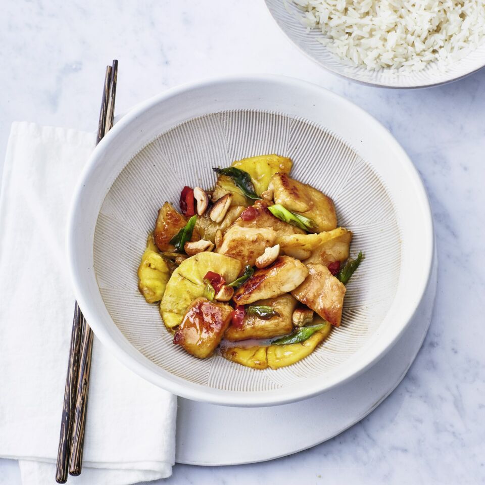 Die Ananas dick schälen, den Strunk herausschneiden und das Fruchtfleisch quer in dünne Scheiben schneiden. Cashewkerne in einer Pfanne ohne Fett bei mittlerer Hitze rösten, bis sie duften. Etwas abkühlen lassen und grob hacken.