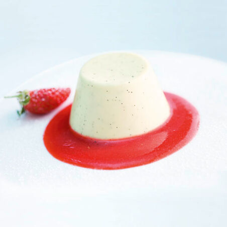 Die Förmchen kurz in heißes Wasser tauchen, die Panna cotta auf Teller stürzen und mit der Erdbeersauce umgießen. Mit den beiseitegelegten Erdbeeren garnieren und servieren.