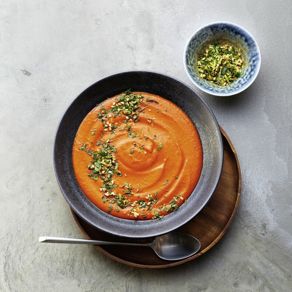 Paprika-Bohnen-Suppe mit Mandel-Gremolata