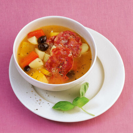 Chorizo, die würzige, grobkörnige und mit Paprika und Knoblauch gewürzte Schweinswurst bringt so richtig Schwung in diese Suppe.