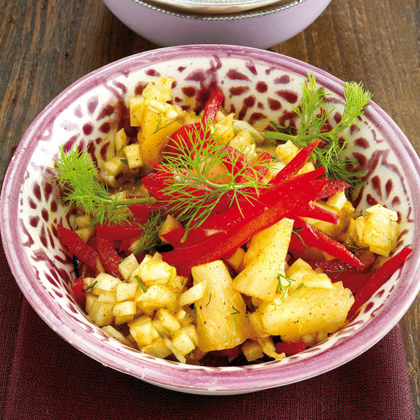 Den Ananas-Saft mit Öl, Essig, Honig und Currypulver verrühren und mit Salz und Pfeffer kräftig abschmecken. Die Paprikamischung mit der Sauce verrühren, 10 Min. durchziehen lassen und nochmals abschmecken. Das Fenchelgrün fein hacken und unter den Salat rühren.