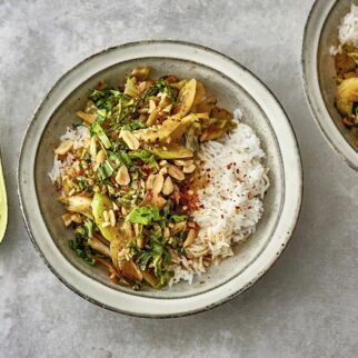 Alles nochmals aufkochen, mit Salz und Pfeffer würzen. Währenddessen die Toastscheiben im Toaster rösten, dann mit der Blumenkohlpfanne auf Tellern anrichten und zum Servieren mit dem Kräuter-Nuss-Topping bestreuen.