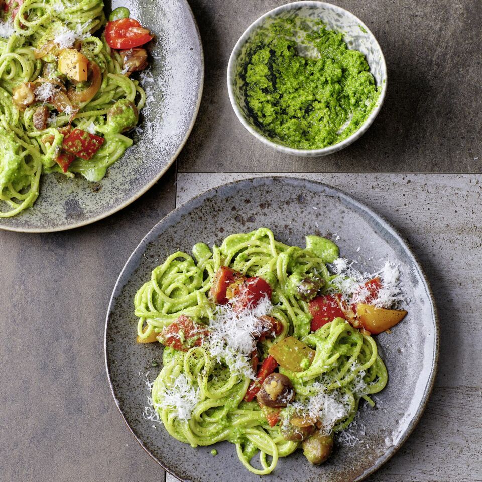 Paprika-Spaghetti mit Grünkohl-Pesto