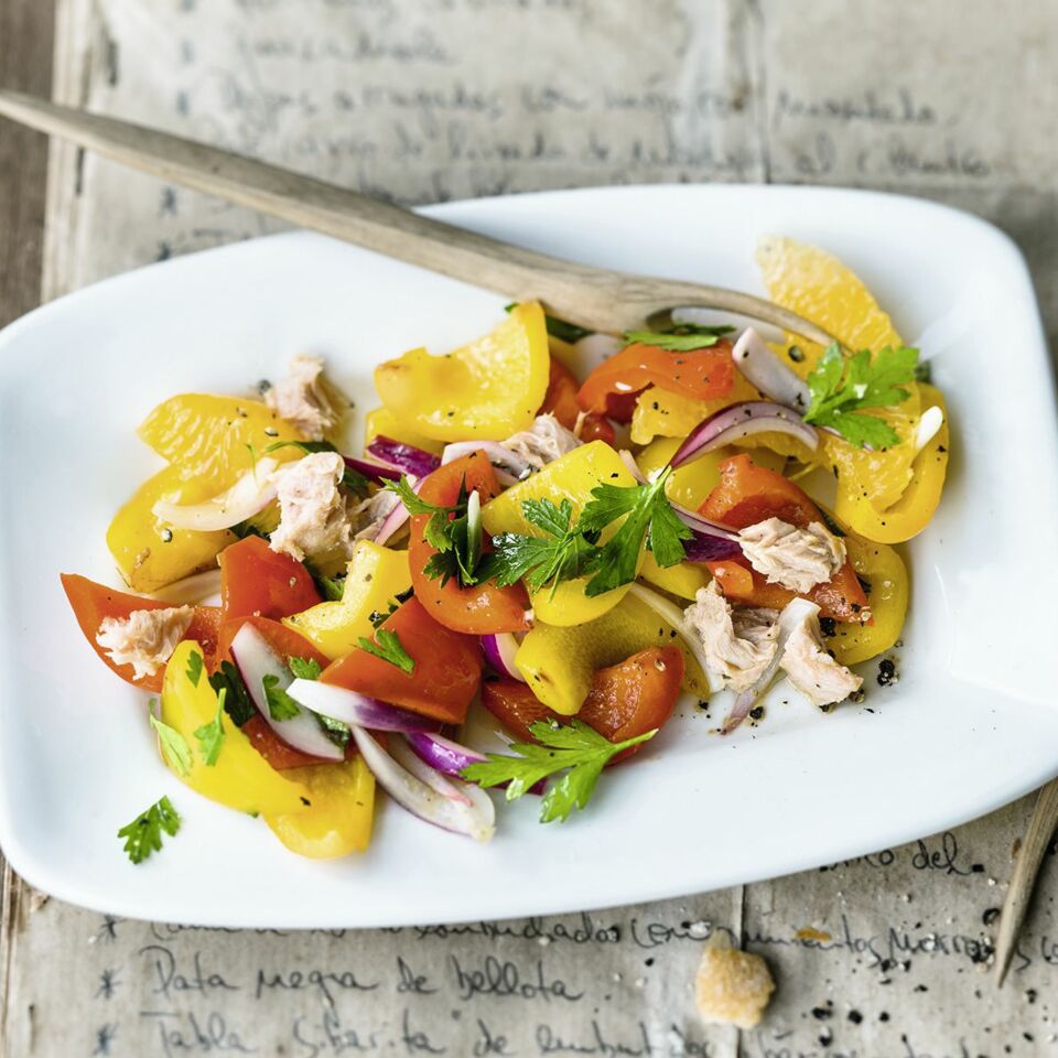 Urlaubsflirt: Dieser knackige, bunte Salat aus Paprika und Thunfisch schmeckt besonders gut zu krossem Baguette oder Ciabatta.