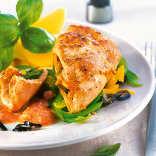 100 ml Brühe mit Frischkäse und Ajvar verquirlen. Aufkochen und bei schwacher Hitze 5 Min. unter Rühren sämig einkochen lassen. Die Sauce mit Salz und Pfeffer würzen und das restliche Basilikum unterrühren. Über die Paprikahälften träufeln.