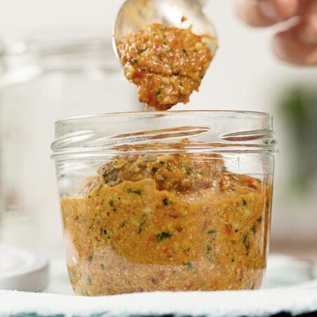 Die Paprika mit den Sonnenblumenkernen, der Petersilie und dem Olivenöl mit dem Pürierstab zu einer feinen Paste mixen. Mit Harissa und Zitronensaft verrühren und mit Salz abschmecken.