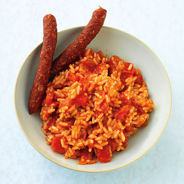 Schmecke das Risotto mit Sojasauce ab und fülle es in einen Teller. Die Salami-Sticks kannst du dazu knabbern.