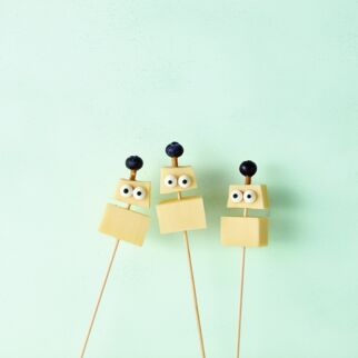 Die Spieße auf einer großen Platte in einem Halbkreis anordnen. Die Zuckeraugen und den Schnabel mit etwas Erdnussmus auf die Birnenhälfte kleben. Die Spieße wahlweise in den Pfauenkörper stecken oder die Birnenhälfte über die Mitte der Spieß-Enden legen und die Füße darunter platzieren.