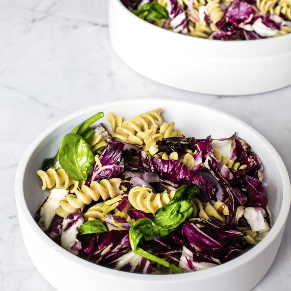 Die Pasta in ein Sieb abgießen und gut abtropfen lassen. Zur Zwiebel-Knoblauch-Mischung in die Pfanne geben. Radicchio, Blattspinat, Zitronenschale und -saft hinzugeben und alles in der heißen Pfanne ca. 1 Min. schwenken. Mit Salz und Pfeffer abschmecken.