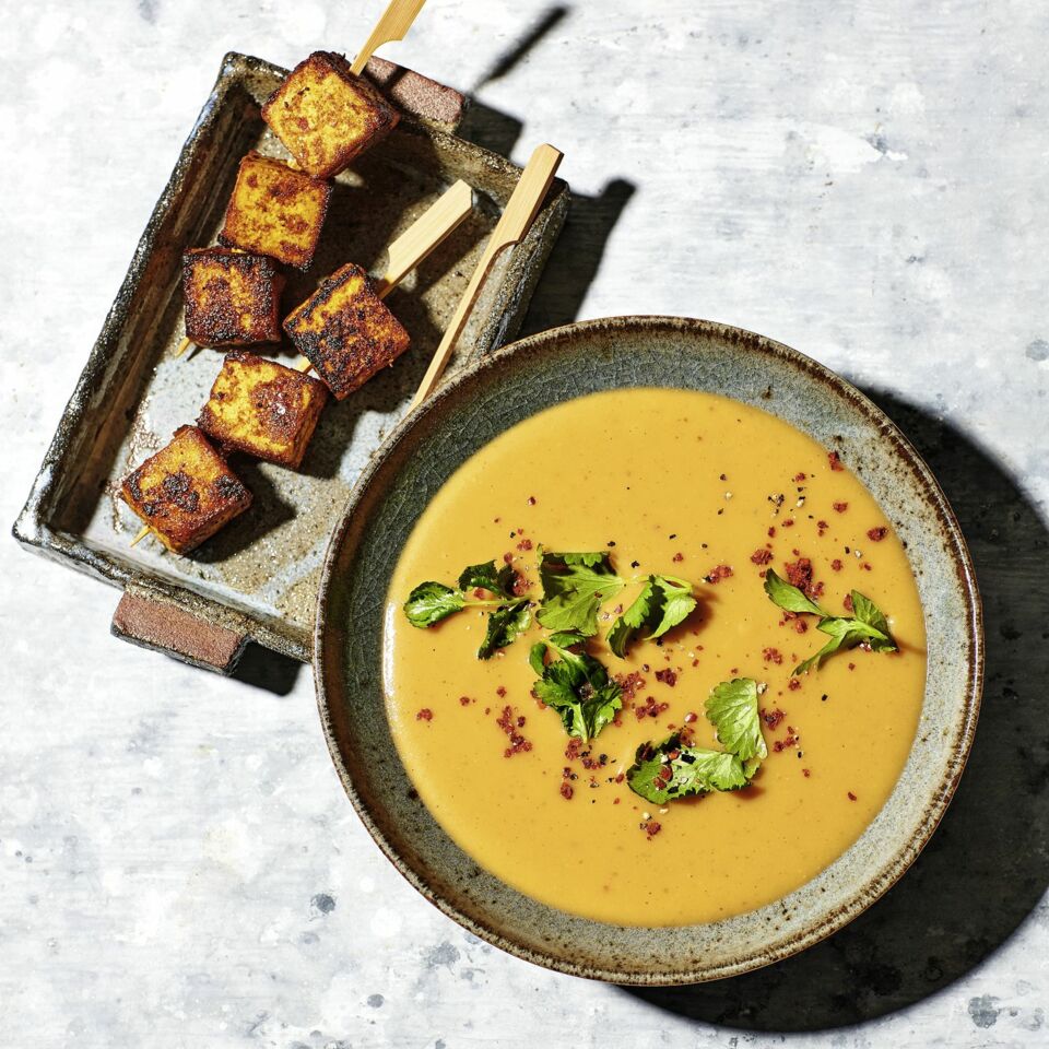 Die Tofuwürfel auf die Spieße stecken. Die Suppe auf zwei tiefe Schalen verteilen, mit Koriander und nach Wunsch mit Chiliflocken bestreuen und servieren. Die Spieße dazureichen oder quer über die Schalen hängen.