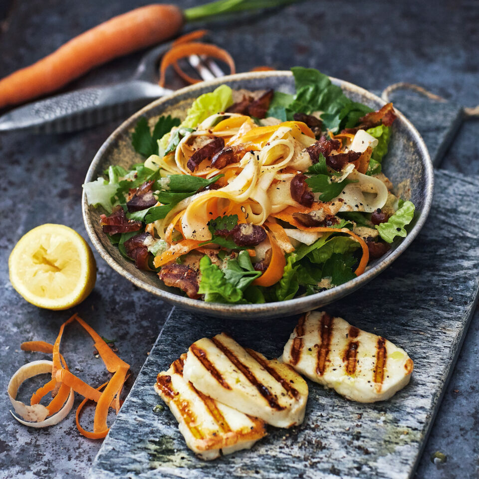 Möhren und Pastinaken werden für diesen feinen Salat hauchdünn geschnitten und kurz gebraten. Dazu gesellen sich Datteln und Halloumi - himmlisch gut!