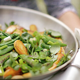 Eier und Sahne verrühren, leicht salzen und pfeffern und über dem Gemüse verteilen. Unter Rühren stocken, aber nicht trocken werden lassen. Schnittlauch oder Frühlingszwiebelgrün abbrausen, trocken schütteln und in Röllchen schneiden. Vor dem Servieren auf das Gröstl streuen.