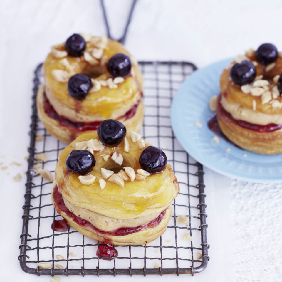 Die Cronuts waagerecht durchschneiden und die Böden mit dem Sauerkirschgelee bestreichen. Darauf jeweils einen Ring Erdnussbutter spritzen und die Deckel wieder auflegen.