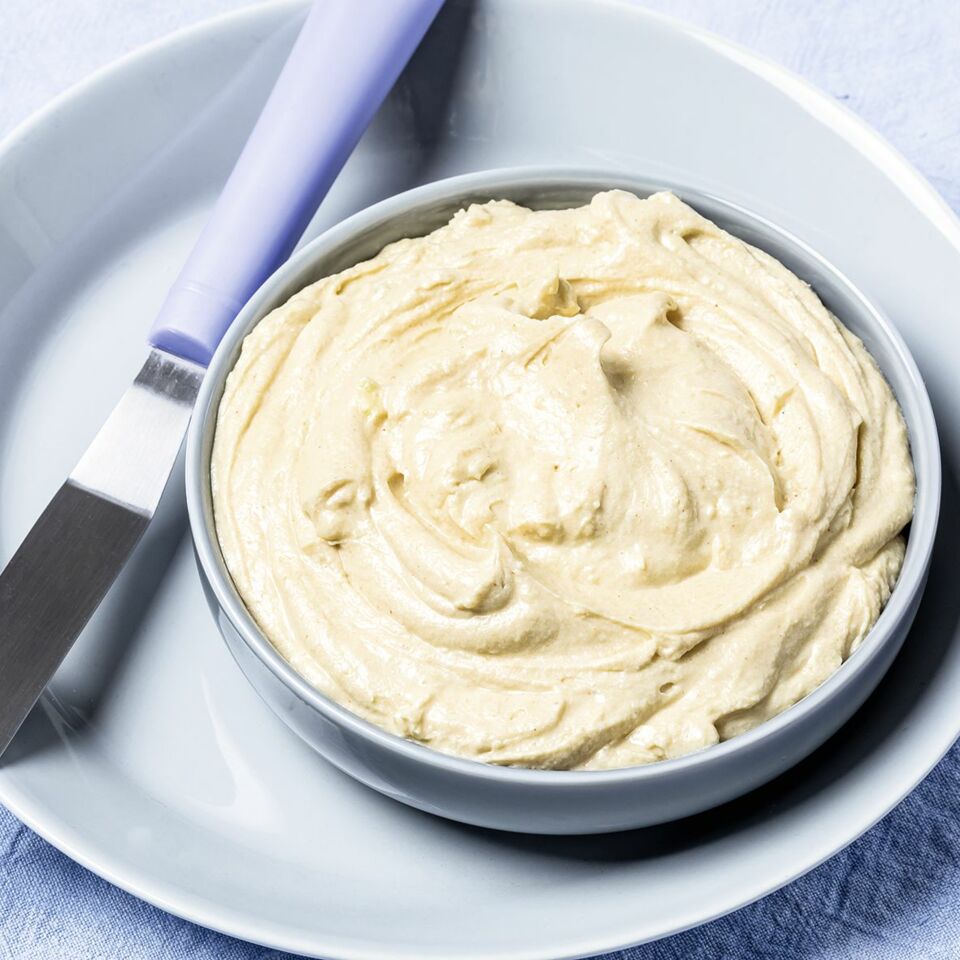 Die Butter in Stücke schneiden und mit den Schneebesen des Handrührgeräts cremig rühren. Dann den Frischkäse, anschließend das Erdnussmus unterrühren.