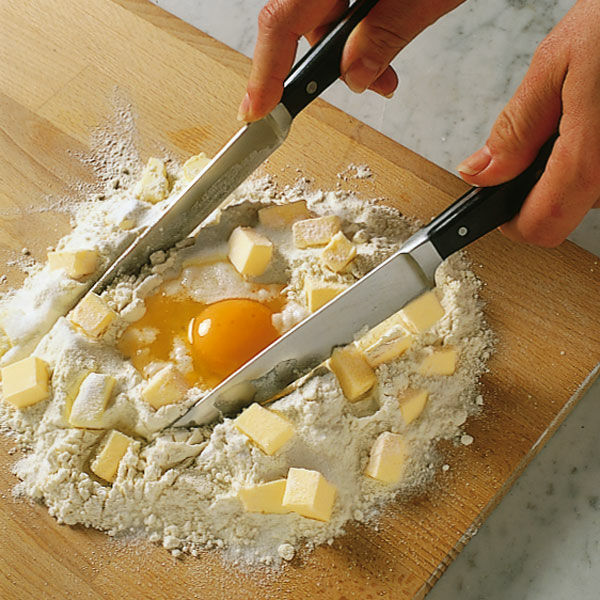 Für den Teig das Mehl auf einem Backbrett mit Zucker, Backpulver, Salz, dem Ei und der in Flöckchen geschnittenen Butter mit zwei Messern hacken und dabei vermischen (Step 1). Kurz durchkneten und, falls der Teig zu trocken ist, noch einige Tropfen eiskaltes Wasser zugeben. Den Teig in Folie wickeln und für ca. 30 Min. kalt stellen.