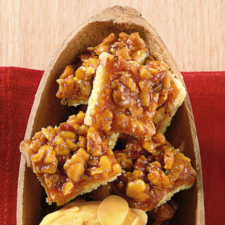 Für das Nusskaramell die Pekannüsse grob hacken. In einem Topf Butter, Honig und Zucker verrühren und unter ständigem Rühren bei mittlerer Hitze schmelzen. Wenn das Karamell hellbraun ist, die Nüsse unterrühren und das Karamell sofort auf dem Teig verteilen. Im Backofen (Mitte) 12 Min. backen. Direkt nach dem Backen mit einem scharfen Messer in 3 × 3 cm große Stücke schneiden.