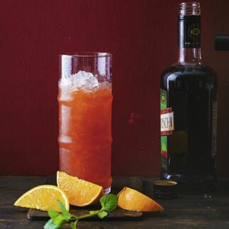 Das Cocktailglas zur Hälfte mit gestoßenem Eis füllen und den Inhalt des Shakers durch das Barsieb dazugießen. Den Cocktail mit der Kirsche und der Grapefruitzeste dekorieren und sofort mit dem Trinkhalm servieren.