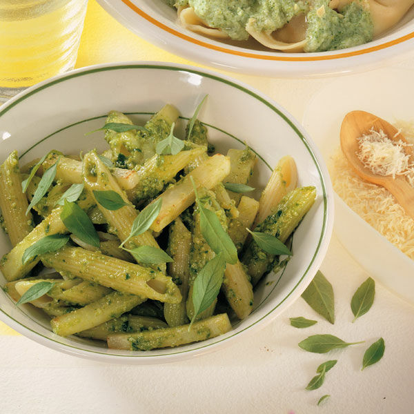 Pesto lässt sich auch ganz einfach aus Basilikum, Parmesan, Olivenöl, Pinienkernen, Knoblauch und Gewürzen selbst herstellen.